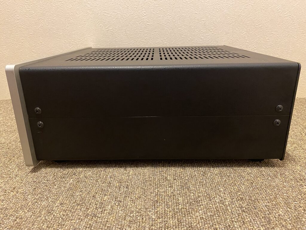 本体は重厚感のある筐体で、しっかりとした存在感を放っています。フロントパネル中央に配置された電源スイッチは、他社ではあまり見られないデザインでユニーク。パネルの厚みも側面から確認でき、剛性感が高い仕上がりです。